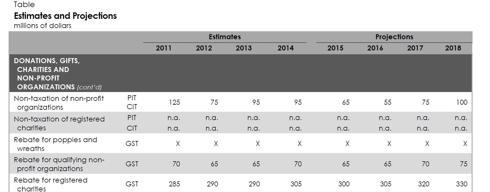 The elephant in the room that is not really discussed is “Many federal government entities provide direct funding to registered charities, non-profit organizations and international development associations through various programs.” Over 2/3 of the revenue of the registered charity sector comes from grants and contributions from the 3 levels of government. This is a grant or contribution and not a “tax expenditure” so it is not dealt with in the report.