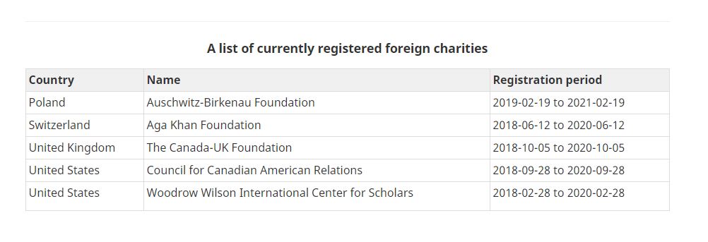 Keep in mind that the placement on the list is only for two years but if the Government of Canada makes another gift it can be renewed. So Woodrow Wilson International Centre for Scholars dropped off on February 28, 2020 but we might find out in a few months that they are back on again or perhaps not.