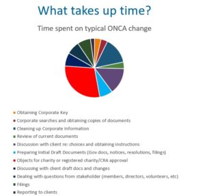 There is a common misconception that preparing the new documents is most of the work. It is often only 10-20% of the time required. There are so many other matters that need to be dealt with like obtaining corporate keys, doing corporate searches and updating directors/officers/addresses, etc. We created a little graphic to illustrate the point.